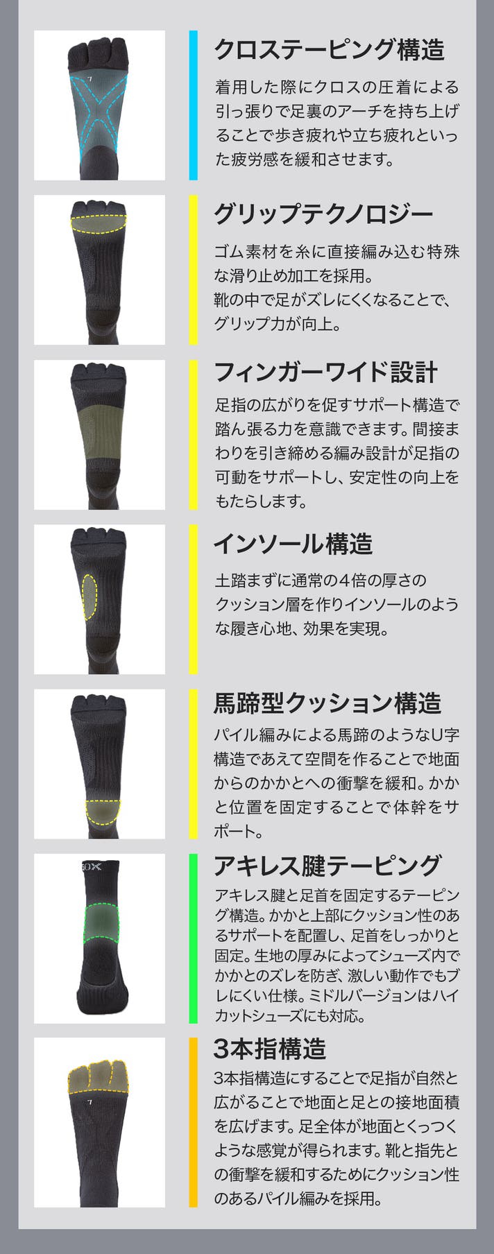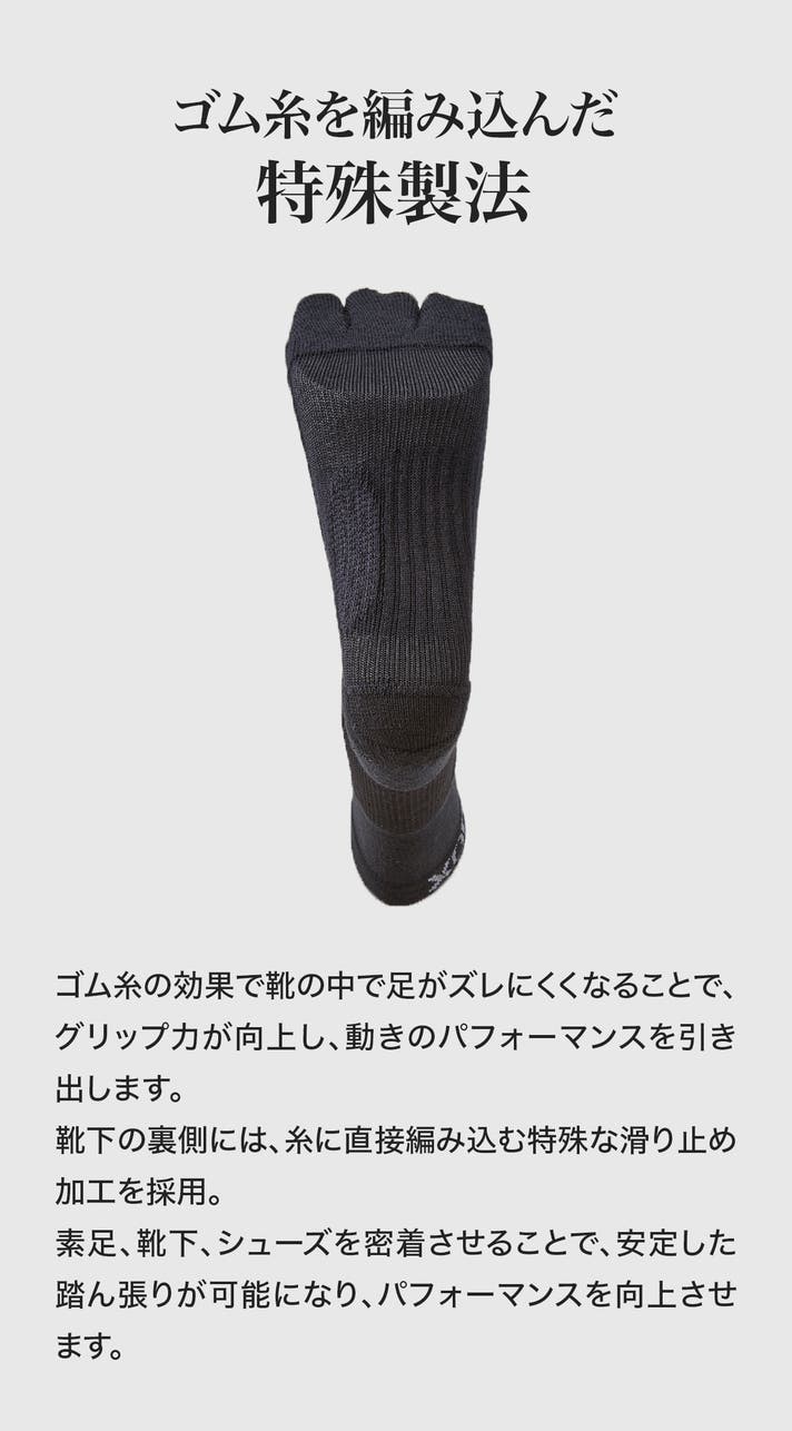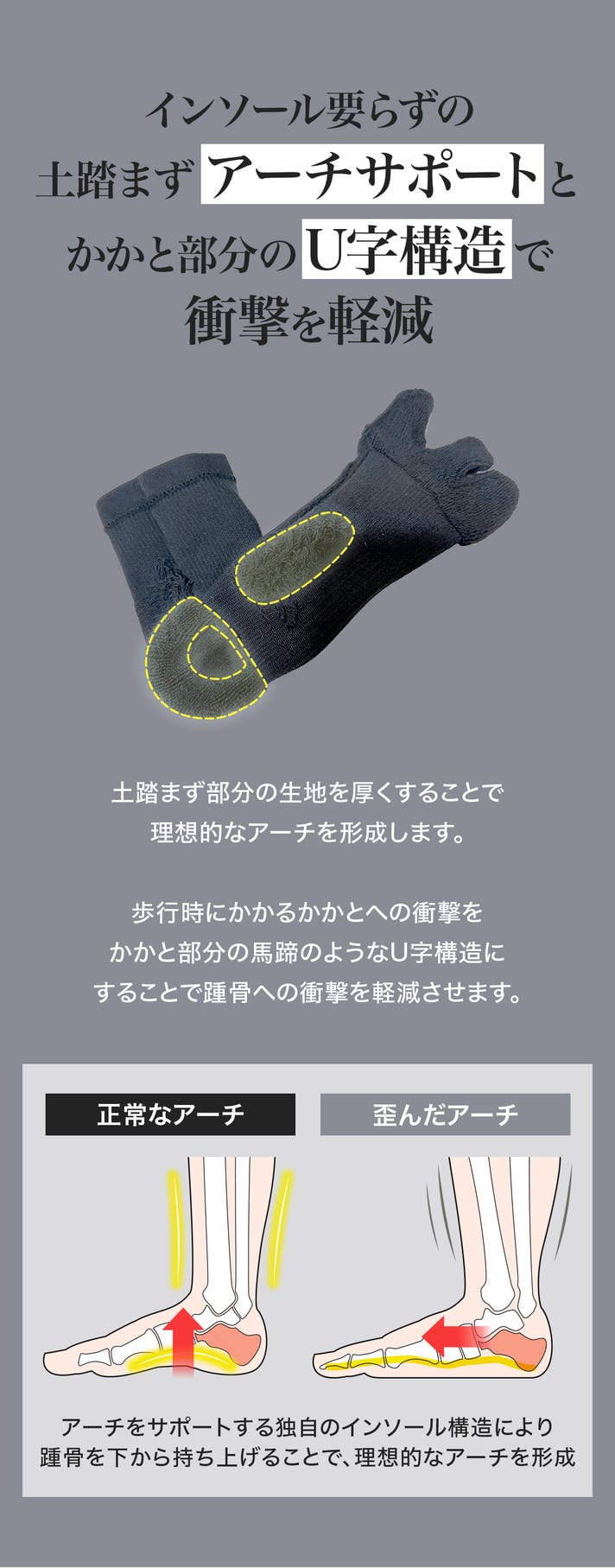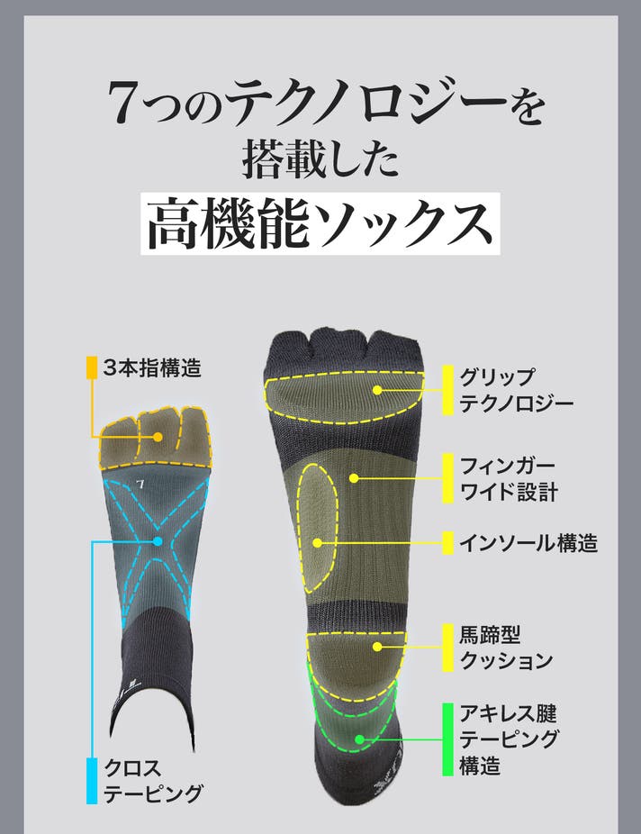 - 衝撃緩和・耐久性・防臭・すべり止め、体幹サポートと様々な機能を盛り込んだ靴下