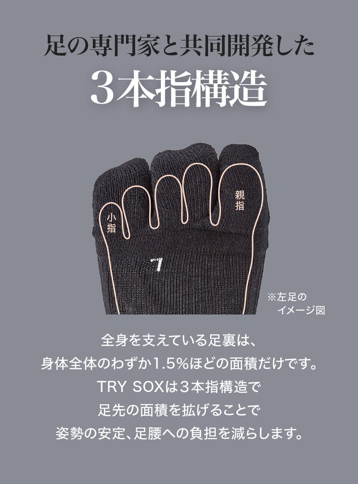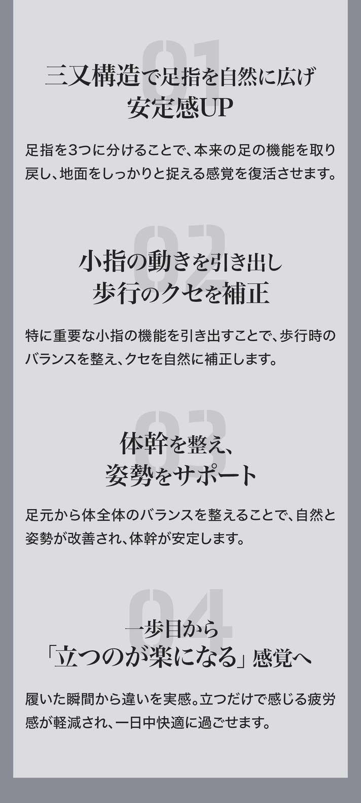 - 3本指構造と着圧設計で足指が自然に広がりやすく、踏み込みやすさを考えた仕様