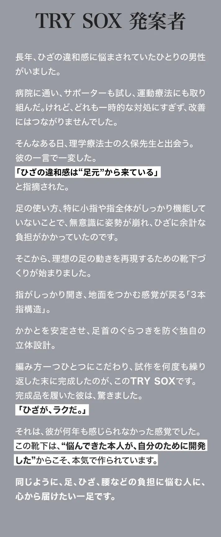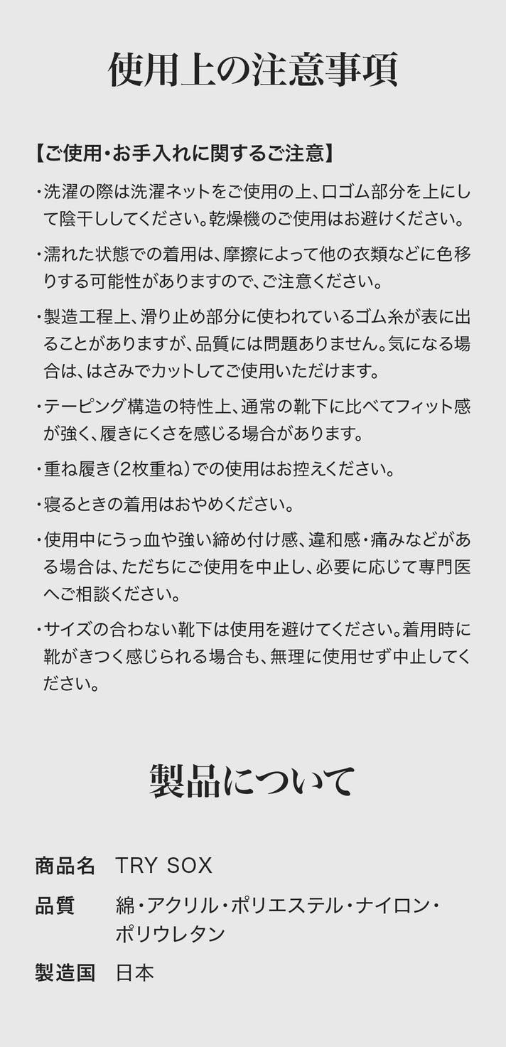 「TRY SOX」のプロジェクトに関しまして、以下の点について事前にご理解とご了承をお願いいたします。 ご注文状況や原材料の供給状況、製造工程の都合、または配送作業中の予期せぬ事態により、商品の発送時期が予定より遅れる場合がございます。 開発中の製品につき、仕様やデザインが一部変更となる可能性がございます。 Makuakeの仕組み上、応援購入いただいた時点でご注文確定となり、キャンセル・返品・返金には対応いたしかねます。 応援購入後はいかなる理由であっても、サポーター様ご本人によるキャンセルはお受けしておりません。 製品の仕様や配送に変更が生じた場合には、「活動レポート」を通じて随時ご案内いたします。 原則として、配送の遅延を理由とした応援購入後のキャンセルはお受けできません。ただし、応援購入のお届け予定月から3ヵ月以上経過した場合には、ご希望の方に限りキャンセルでの対応をいたします。 ▼商品等の不具合による返品・交換 原則として、サポーター様のご都合によるキャンセル・返金は承っておりません。 (サポーター様のご都合のキャンセル不可の例:サイズが合わない、誤注文、長期不在) ◾️対応条件: 商品の初期不良、またはお届けした商品がご注文内容と異なる場合、到着後14日以内にプロジェクトページの「実行者にメッセージ」よりご連絡ください。状況を確認の上、良品との交換対応をさせていただきます。 ◾️返品送料/再送料: 実行者負担 【返品・交換をお受けできない商品】 ・サポーターの責任により破損、汚損が生じた商品 ・商品のタグ、付属品、パッケージ(箱、袋など)を紛失、破棄、使用や洗濯された商品 ・事前にご連絡をいただいていない商品 ・商品到着後、15日以上経過した商品 ご不便をおかけする可能性もございますが、ご理解のうえで応援購入いただけますよう、心よりお願い申し上げます。 最後となりますが、応援購入いただく皆さまに喜んでいただけるように準備を進めてまいりますので応援のほどよろしくお願いいたします。