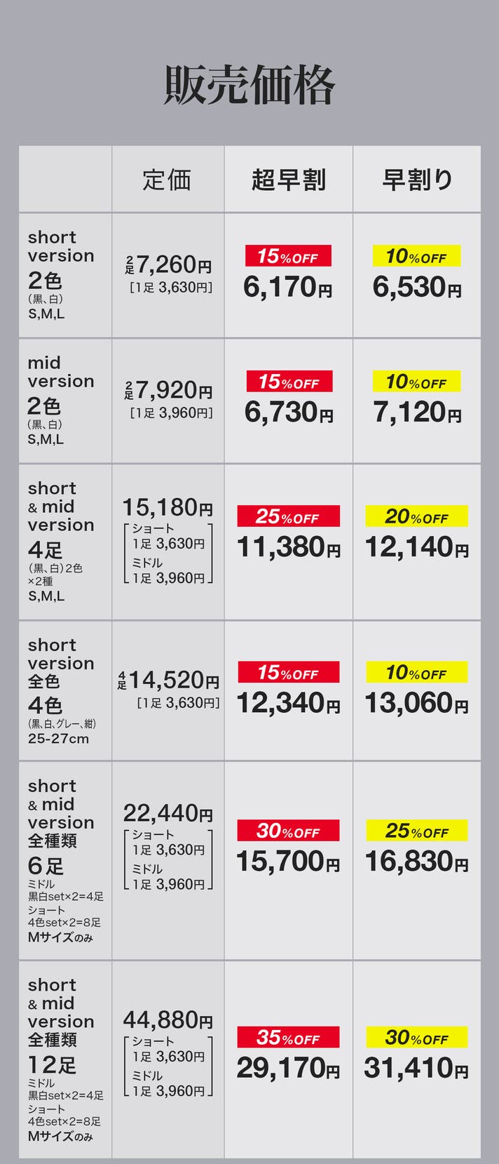 short定価:1足3,630円(税込)×4色(白、黒、グレー、紺)×2セット=8足 29,040円(税込)