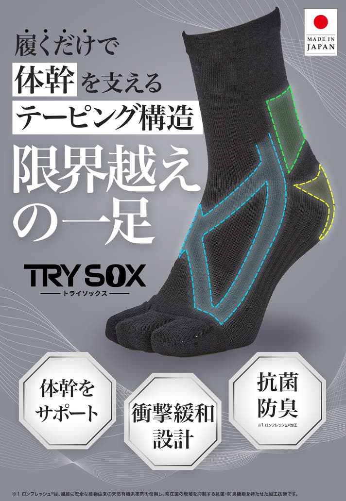 「Makuake(マクアケ)」は、実行者の想いを応援購入によって実現するアタラシイものやサービスのプラットフォームです。このページは、 スポーツカテゴリの 「テーピング×着圧×インソール発想の靴下|専門家が監修した体幹を支えるTRYSOX」プロジェクト詳細ページです。