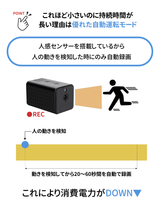 - 超小型カメラだから目立たず、工事も配線も不要!届いた日からすぐに使えます。
