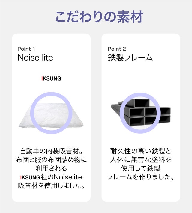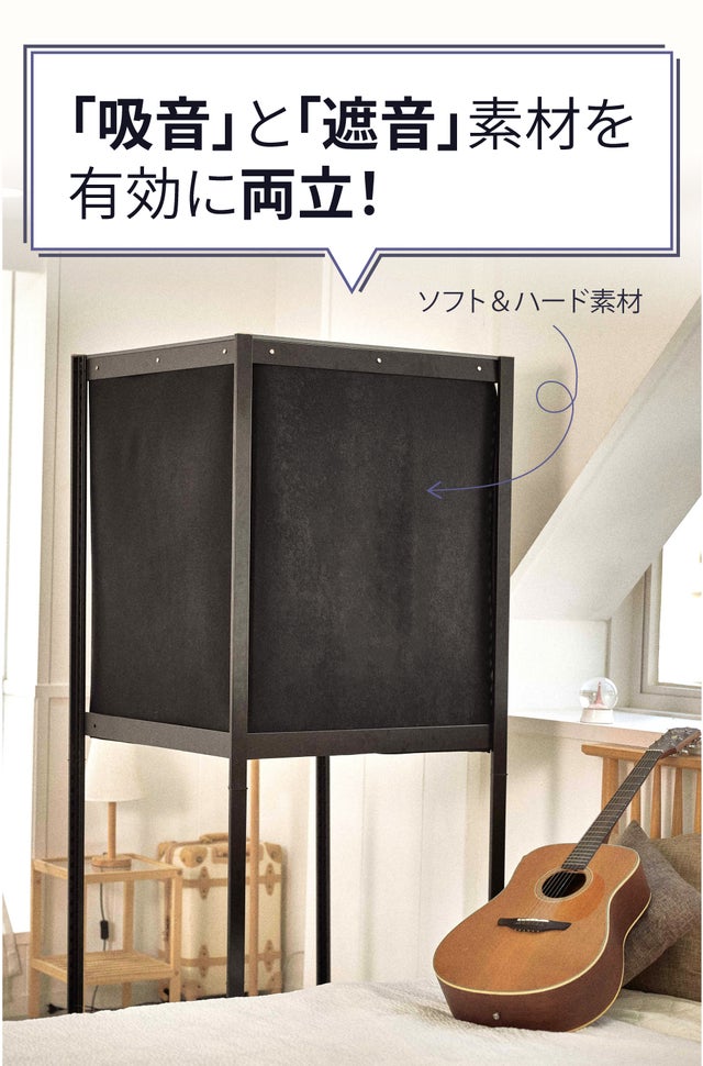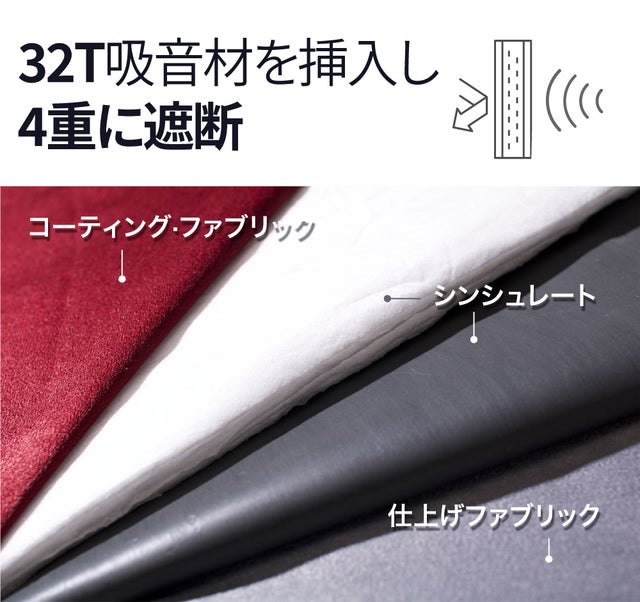クッション性ある防音カーテンのようなファブリックと間にパネルを取り入れた4重構造で、高価の防音ボックスに負けない遮音効果を実現しました。