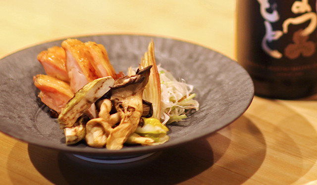1つ目は、綺麗な酸があり洗練された味わいの 「醸し人九平次 黒田庄に生まれて」。こちらを 甘みのある「海老やイカ」と合わせると、互い素材の持ち味をより引き立てた、素晴らしい味わいが広がります。