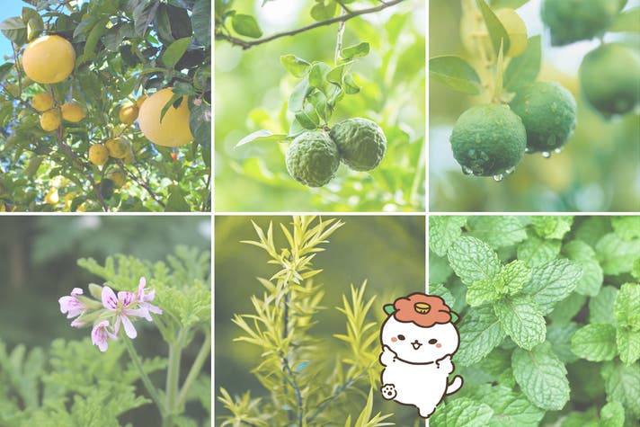 グレープフルーツ果皮油、ベルガモット果実油、ライム油、ニオイテンジクアオイ花油、ティーツリー油、ハッカ葉油