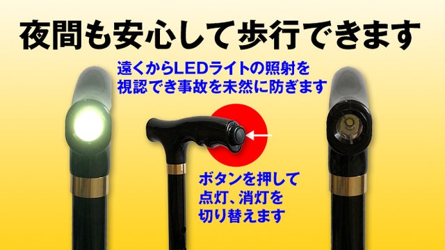 - 遠方からも視認可能な強力LEDライト付きで夕暮時、夜間も安心して歩行できる杖です