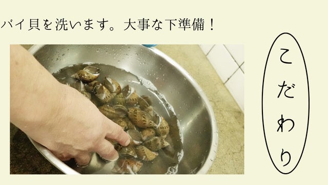 バイ貝とアワビを選んだのはシンプルな料理ながら、仕出し屋ならではの味を感じて頂きたかったらです。