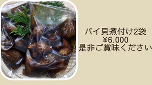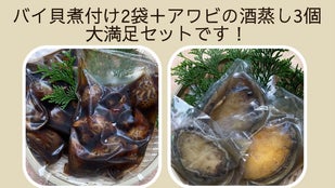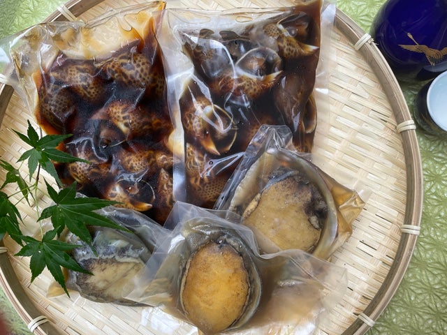 バイ貝煮付けを2袋、アワビの酒蒸しを3個、こちらを1セットにしてお届けします