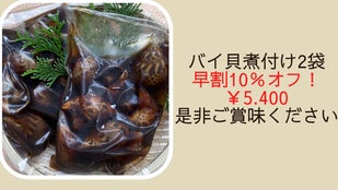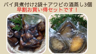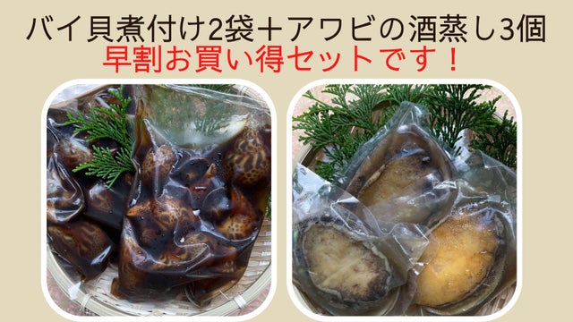 【早割10%オフ】バイ貝煮付け×2、アワビの酒蒸し×3のセット