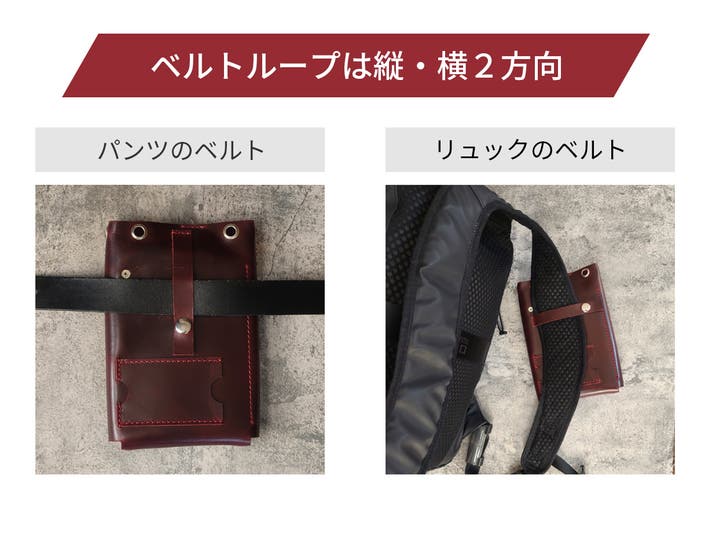 ベルトループは縦・横2方向あるため、パンツのベルトやリュックにも設置可能。