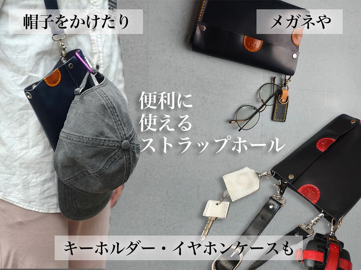 ハトメ(穴が開いた金具)にキーケースやイヤホンケース、帽子や眼鏡を掛けたり。あなたらしい使い方を探してみてください。