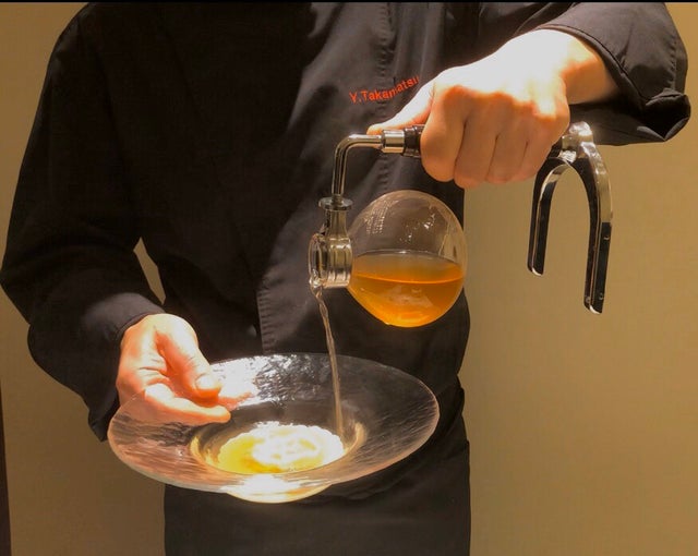 ポルチーニ茸等を使用した香り高く旨味も濃厚なスープを、月替わりのお肉料理と共に提供いたします。サイフォンを使い目の前でポルチーニ茸から香りを抽出するため、より高い香りがお肉料理を包み込みます。