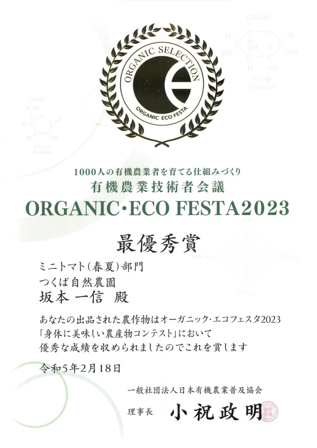 “日本一”のトマトジュース作りの第一歩は、究極のトマトを作ることから始まりました。坂本は、9年におよぶ独自の栽培研究を経て、2020年夏に就農。そこからわずか2年で、(社)日本有機農業普及協会が主催する「オーガニックエコフェスタ2023 ミニトマト部門」で、最優秀賞を勝ち得ました。