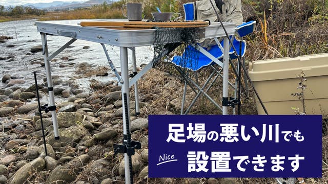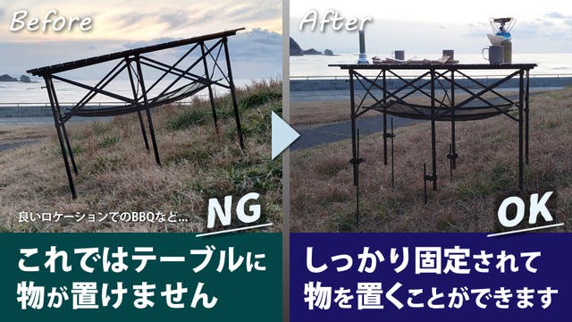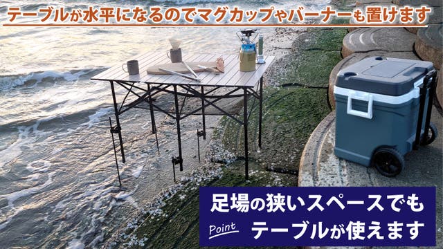 - 斜面で水平が保ちたい!河原でテーブルや焚火台が使いたい!風が強くて動くので固定したい!