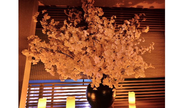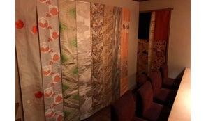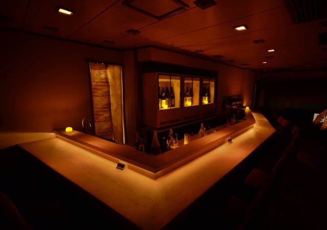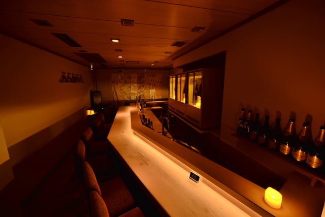 カウンター: 白檜の1本カウンターがあり、ろうそくにライトアップされる桜、50本を超える着物帯が店内を演出しています。