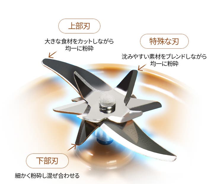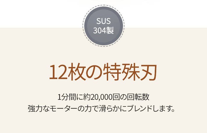 A:12枚刃のSUS304ステンレス製ギザ刃ブレードと毎分20,000RPMのモーターにより、氷や冷凍フルーツもクリーム状に仕上がります。