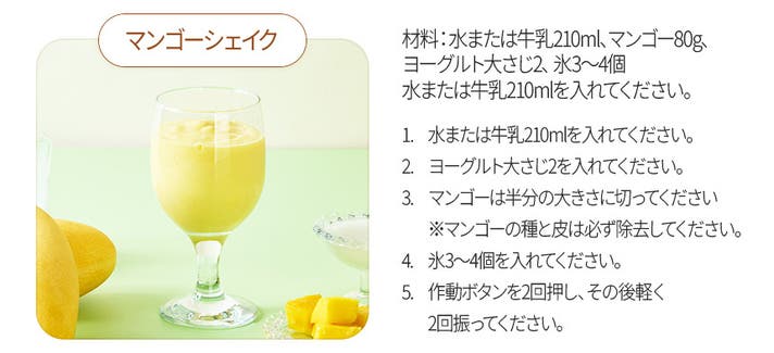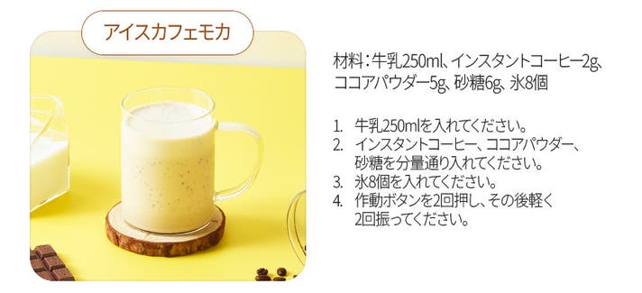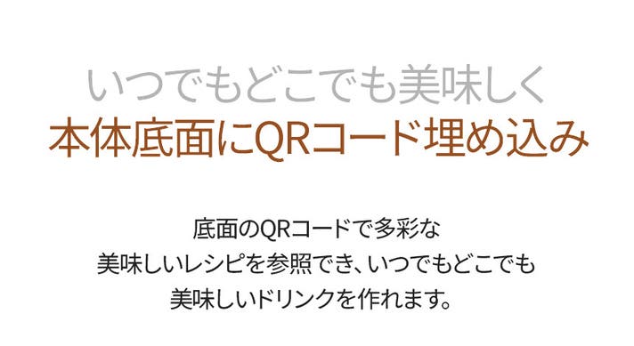 A:ブルーベリーシェイクやマンゴーシェイク、ABCジュース、アイスカフェモカなど、本体底面QRコードからプロの開発したレシピがいつでも参照できます。
