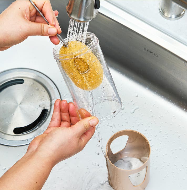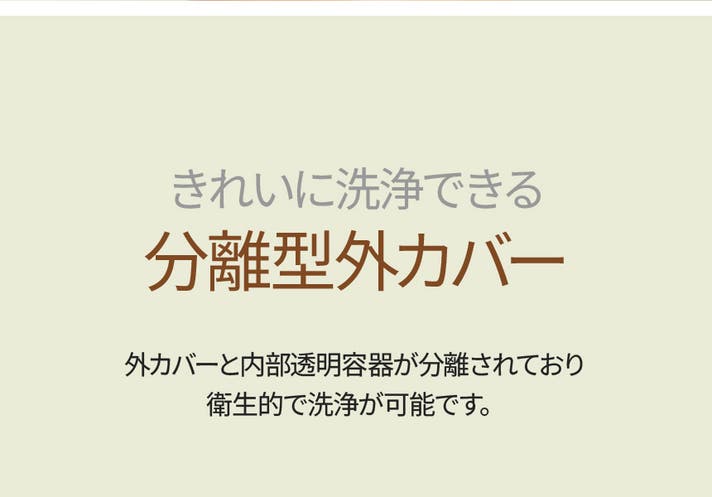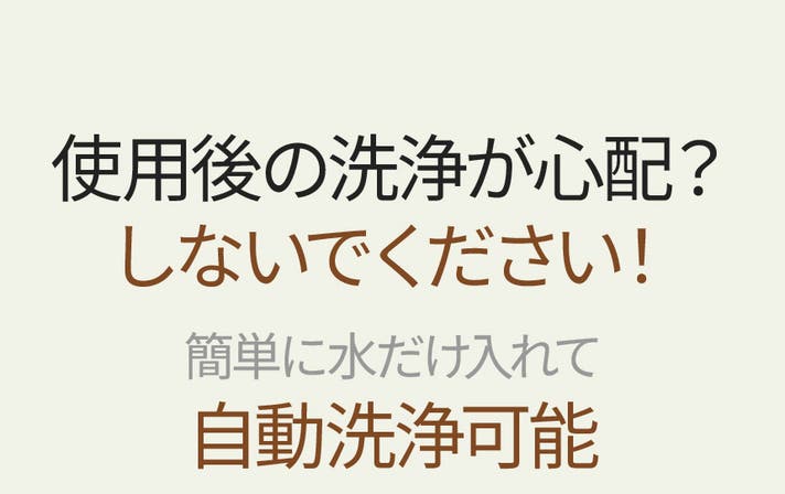 A:ボトルに水を半分ほど入れ、作動ボタンを2回押せば自動で内部を簡単に洗浄できます。カバーと透明容器は分割洗浄可能です。