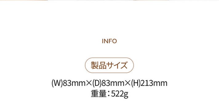 A:本体+ボトルで約522g、83×83×213mm。コンパクトかつ軽量で、片手でグリップしやすい設計です。