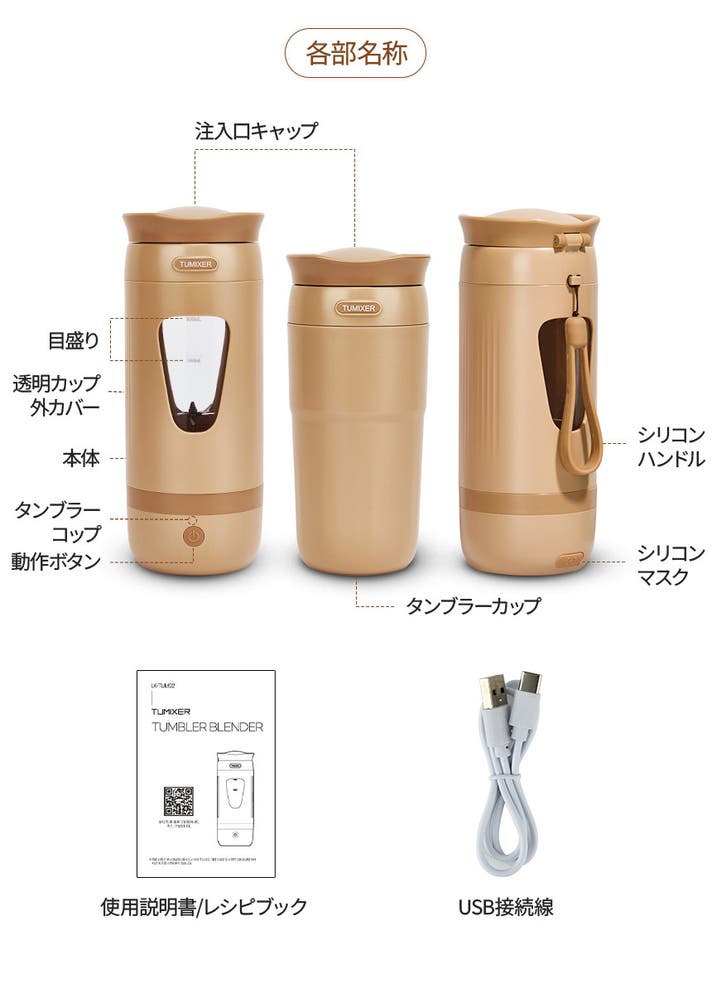 A:本体、350mlタンブラー容器、USB-Cケーブル、取扱説明書がセットになっています。
