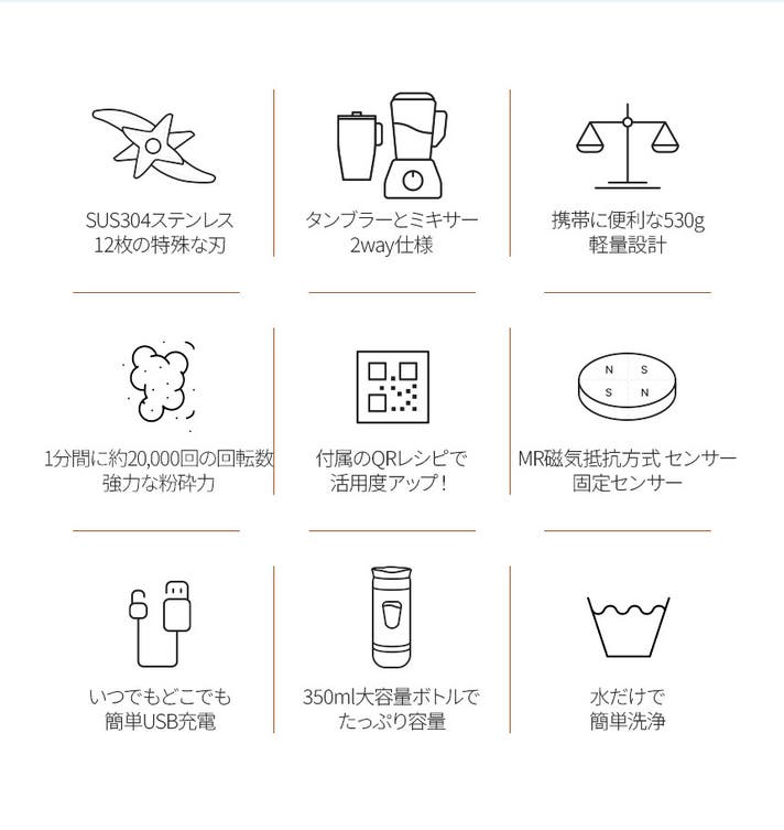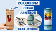 - どこでも使えるUSB充電式で手軽に本格スムージー