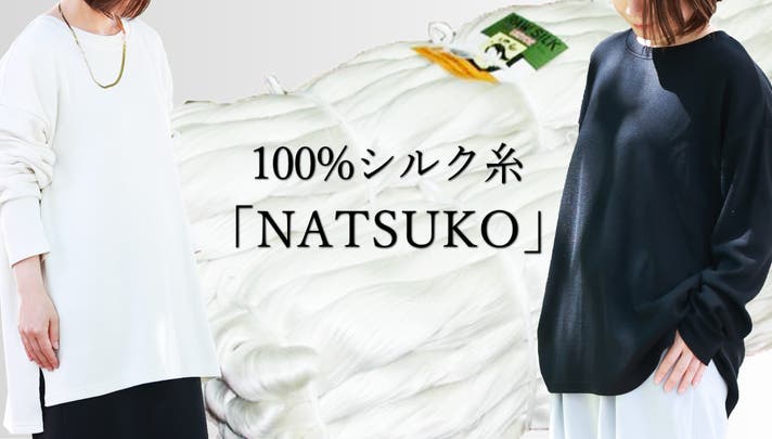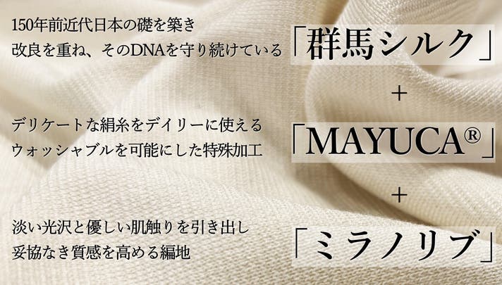群馬産の長繊維「NATSUKO」を、ミラノリブの編み組織で編むことで、シルク特有の滑らかさと上品な光沢を保ちながらも、衣料としての安定感・着やすさを両立させました。さらに東洋紡糸のプロテインコーティング「MAYUCA」により、絹鳴りを抑え、白化や摩耗を低減して家庭での洗濯(ウォッシャブル)にも対応しています。これにより“高級感”と“デイリーケア性”という相反する価値を同時に実現しています。