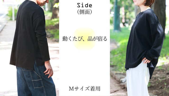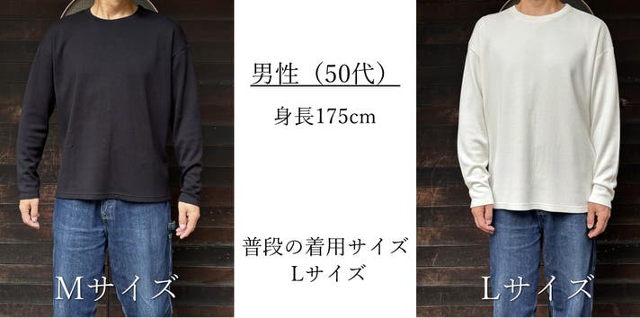 参考までにMサイズのサンプルを60代のお腹の立派な少し太めの男性に試着していただきましたが、ピッタリジャストなロンTな感じだったのでLサイズをオススメしました。