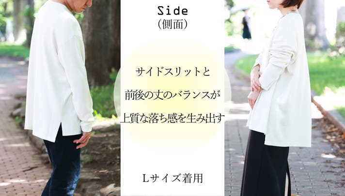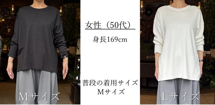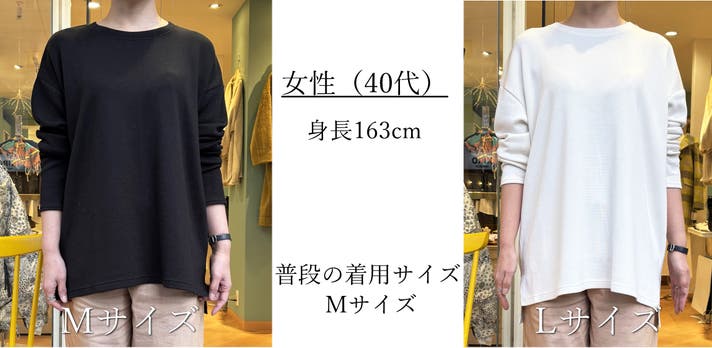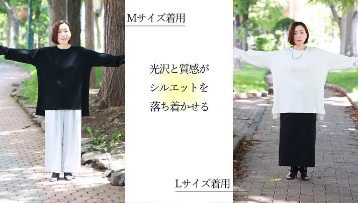 Mサイズでオーバーサイズでゆったり滑らかな着心地です。Lサイズはかなり大きいのですが、しっとり落ちる感じで着られてる感じはなく色々着回しできそうです。
