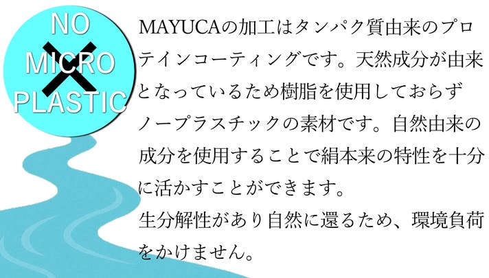 マイクロプラスチック問題は世界的に大きな課題となっています。主に人工芝や敷物、マット、何より衣料品の合成繊維などから発生すると言われています。合成繊維の服の一回の洗濯で70万~120万のマイクロファイバーが放出されている可能性があり、海洋マイクロプラスチック全体の35%を占めると言われています。シルクは天然繊維ですが、一般的なシルクのウォッシャブル加工は石油由来の樹脂を使用しているため、ほぼ合成繊維のような仕様になってしまっています。