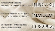 群馬が開発した新しい蚕品種を、碓氷製糸で丁寧に紡がれた特別なシルク生糸「なつこ」に、東洋紡糸工業が開発した特殊技術で加工された100%シルク糸