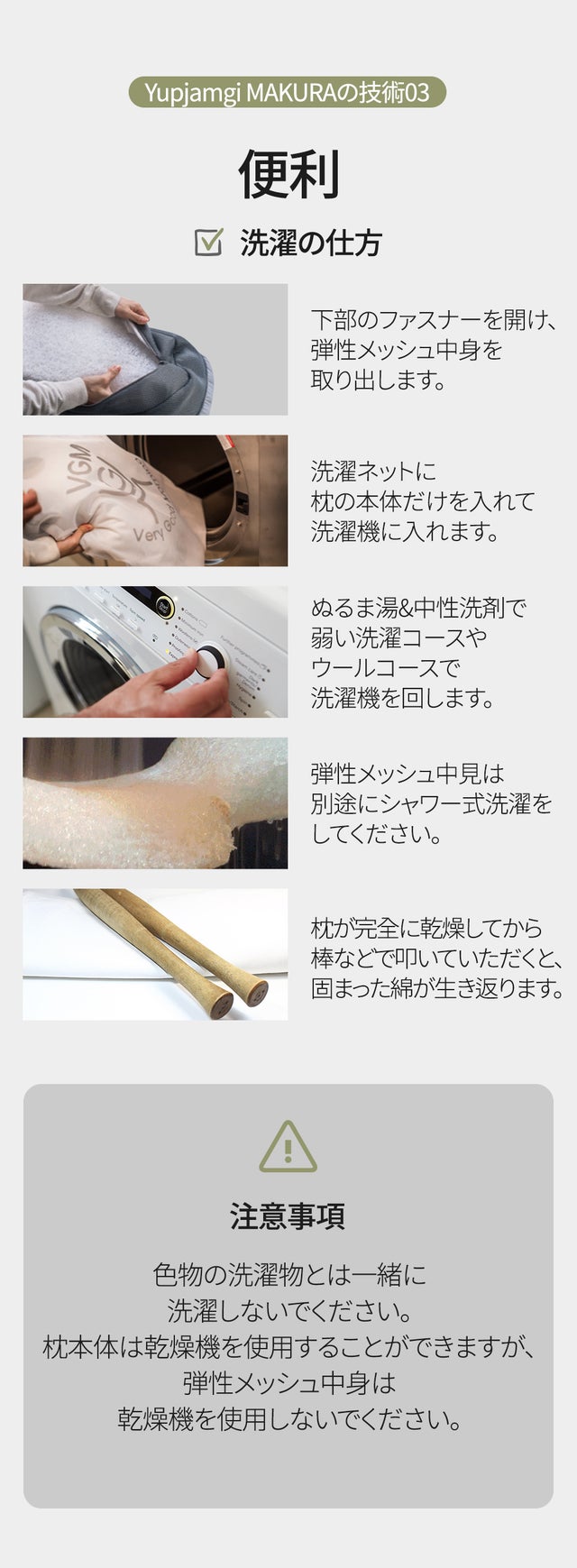枕本体は乾燥機の使用が可能ですが、弾性メッシュ中身は乾燥機を使用する場合、形が変形する原因となりますのでご注意ください。