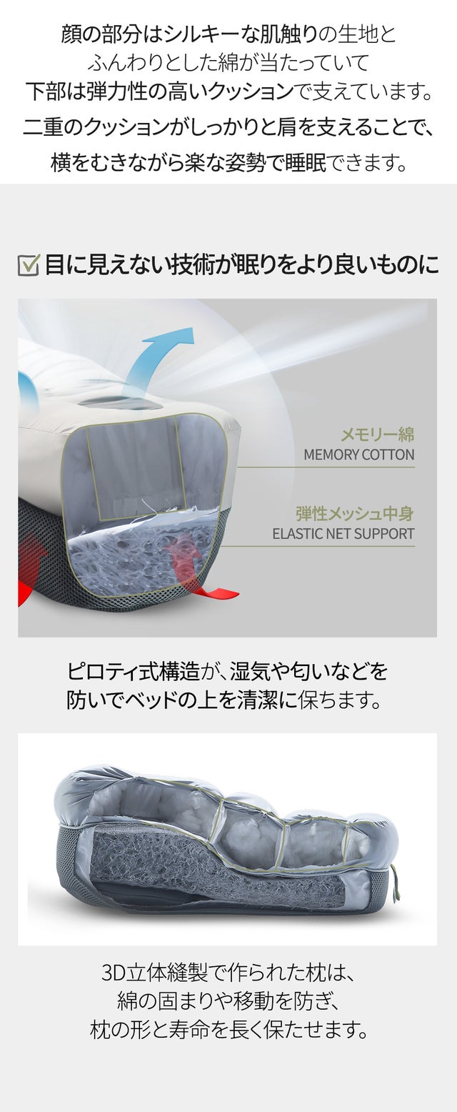 - 3D縫製技法で、耳を圧迫しないで横向きに眠れる添い寝枕