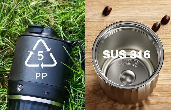 毎日の使用や過酷な屋外環境にも耐えられるように耐久性の高い素材を使用し、下部の魔法瓶カップは優れた耐久性、耐腐食性を誇る食品グレードの「SUS316」 の高級ステンレスを使用。