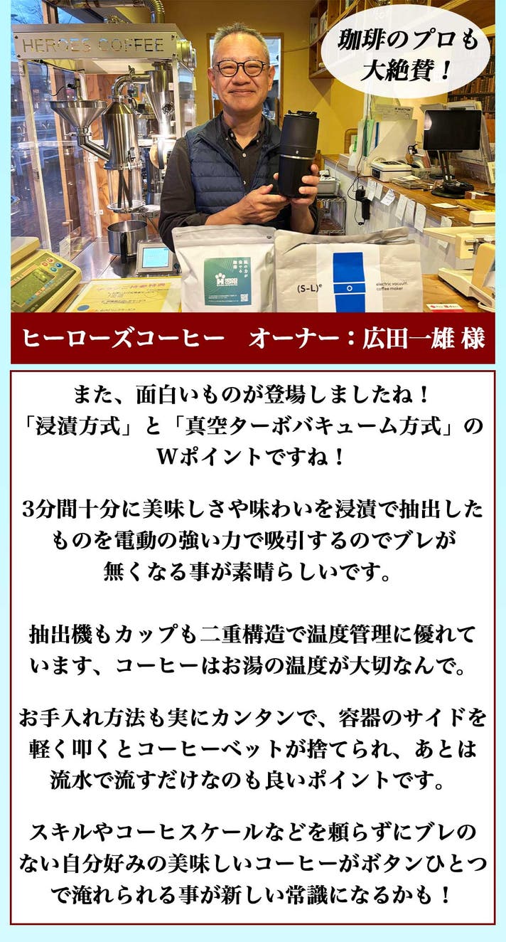 珈琲豆職人でヒーローズコーヒーのオーナー:広田一雄さんを始め、その手軽さからは考えられない味わいの深さに、驚きと関心のコメントを頂いています。