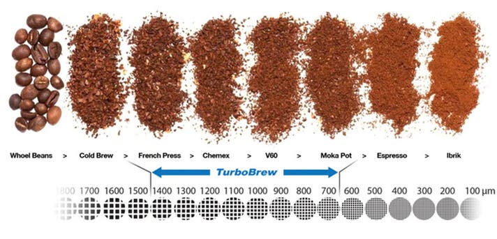 コーヒー豆の引き方のおすすめ:「Turbo Brew」は、 150ミクロンという微細な目開きを持つ特別設計のステンレス製フィルターメッシュを採用しているため、ほとんどの挽き具合に対応しています。