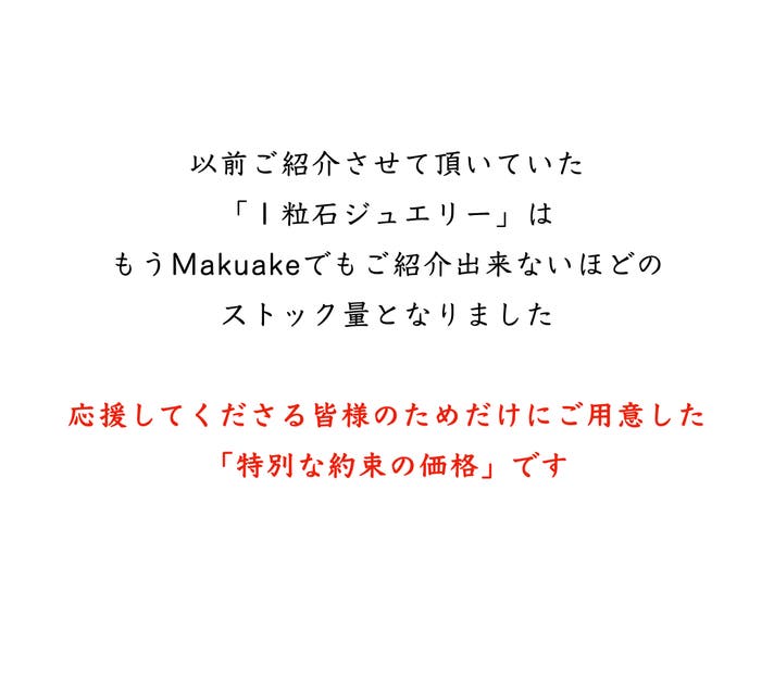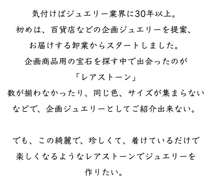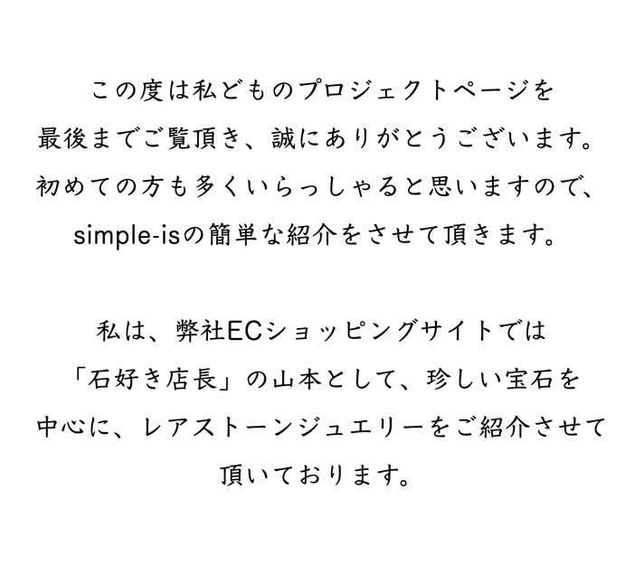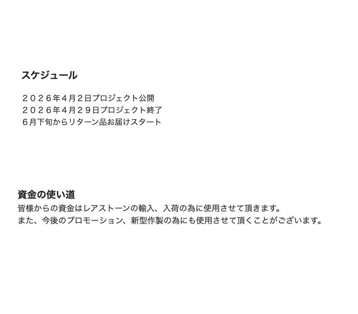 今回のリスク&チャレンジ *使用間、サイズ感等に関する返品、返金はお受け致しかねます。 *ジュエリーは手作りの部分が多くございます。表記サイズよりも若干の誤差があることがございます。 *10金を使用いたしておりますが、痒みや痛みなどの症状が出た場合はご使用を 中止してください。 *プロジェクト終了後、為替の変動により、プロジェクトの販売価格より下がる場合もございます。 *天然石を使用しております。それぞれに石の個性があり、写真と少し異なって見えたり、 写真より内包物が多くあることがございます。ご了承ください。 ※使用感等に関する返品・返金はお受けいたしかねます。 ※開発中の製品につきましては、デザイン・仕様が一部変更になる可能性もございます。 ※応援購入の数が想定を上回った場合、製造工程上の都合等により出荷時期が遅れる場合がございます。 配送に遅れが生じる可能性が判明した場合、直ちにご報告させていただきます。 ※本プロジェクトを通して想定を上回る皆様から応援購入頂き、現在進めている環境から量産体制を更に整え ることができた場合、正規販売価格が販売予定価格より下がる可能性もございます。 ※本プロジェクトの実施において十分確認は行なっておりますが、類似品が発覚する可能性がある点、ご了承願います。 ※原則として、配送遅延に伴う応援購入のキャンセルはできませんが、 リターン配送予定月から3ヵ月を超えた場合には、希望者に限りキャンセルにて対応させていただきます。 応援購入サービスの性質上、以上の注意点につきましてあらかじめご理解とご了承いただいた上で応援購入くださいますよう、よろしくお願い申し上げます。 【商品等の不具合による返品・交換】 原則として、サポーター都合によるキャンセル・返金は承っておりません。 (サポーター都合のキャンセル不可の例:誤注文、長期不在) ◾️対応条件: (例)商品の初期不良、またはお届けした商品がご注文内容と異なる場合、到着後14日以内にプロジェクトページの「実行者にメッセージ」よりご連絡ください。状況を確認の上、返金対応、または良品との交換対応をさせていただきます。 ◾️返金額: (例)リターン金額(税込)の全額 ◾️返品送料/再送料: (例)実行者負担 【返品・交換をお受けできない商品】 (例) ・サポーターの責任により破損、汚損が生じた商品 ・商品のパッケージ(箱、袋など)を紛失、破棄された商品 ・事前にご連絡をいただいていない商品 ・商品到着後、15日以上経過した商品