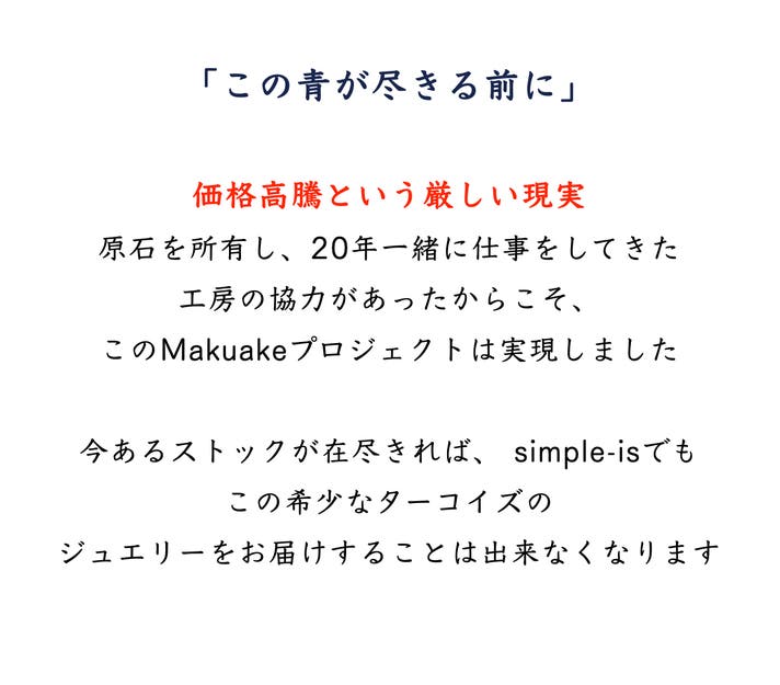 「Makuake(マクアケ)」は、実行者の想いを応援購入によって実現するアタラシイものやサービスのプラットフォームです。このページは、 ファッションカテゴリの 「【閉山】スリーピングビューティー鉱山産の中のさらに「特別」なターコイズを使用」プロジェクト詳細ページです。