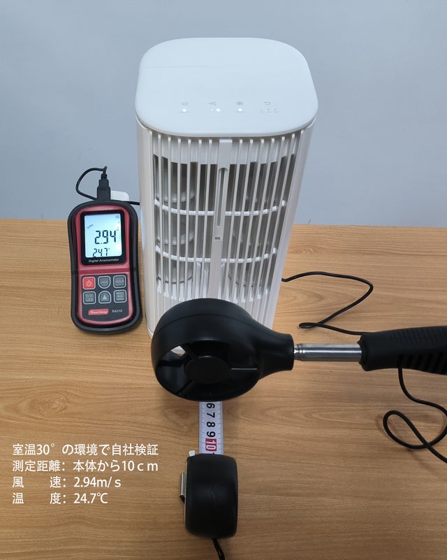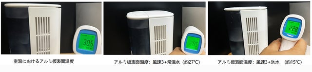 室温30°の環境で、冷風扇から約15cmの位置にアルミ板を設置し、アルミ板の表面に当たったミスト温度を測定した結果を記載するの検証方法を使いました。