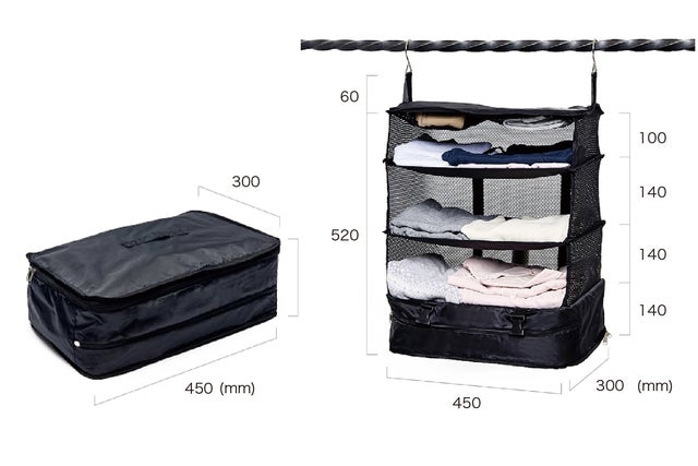 出張やご家族全員での旅行先で、スーツケースからこのアコーディオンポーチを取り出し、ホテルのクローゼットに掛けるだけ!