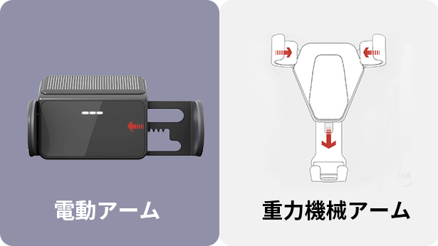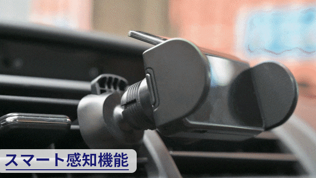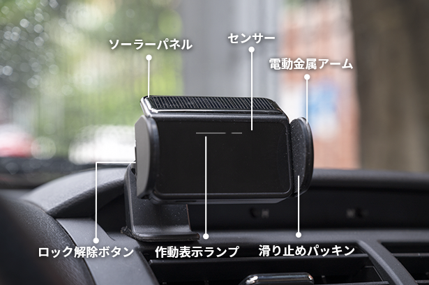 ボディ左側のボタンをワンタッチするとアームが開き、スマートフォンを近づけると「TYN-01」の内蔵センサーが感知し、電動アームが自動で挟みます。