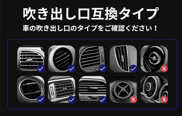 「TYN-01」は、車のエアコン通風口部分に挟んで使用します。様々な通風孔と互換性があり、簡単に取付けられるためとても便利です。