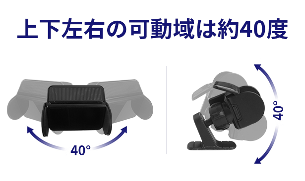 上下左右の可動域は約40度。ボールジョイント仕様なので、スマートフォンのスクリーン視野角をスムーズに変更することが可能です。