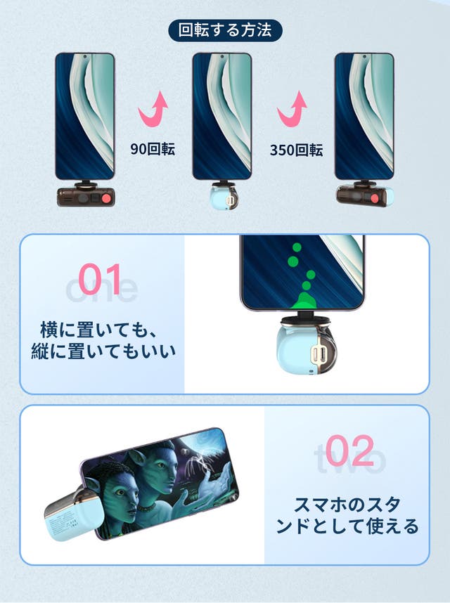 Type-C充電ポートは350°回転可能、スマホのスタンドとして使用することができます。ビデオ電話、映画鑑賞などに便利に楽しめます。