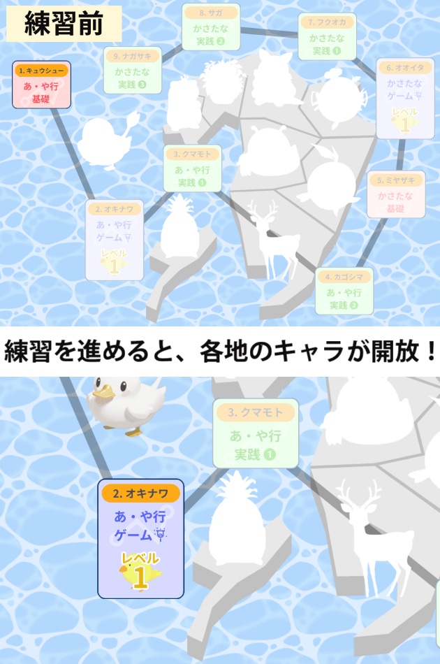 タイピング練習の項目は基礎、ゲーム、実践の3種類あります。ひとつの練習を完了すると、次の練習項目が開放されます。練習の進捗が視覚的に把握できます。日本、世界、宇宙…ですべての項目をクリアすると、全てのキャラが開放され、タイピングをマスターしたことになります。