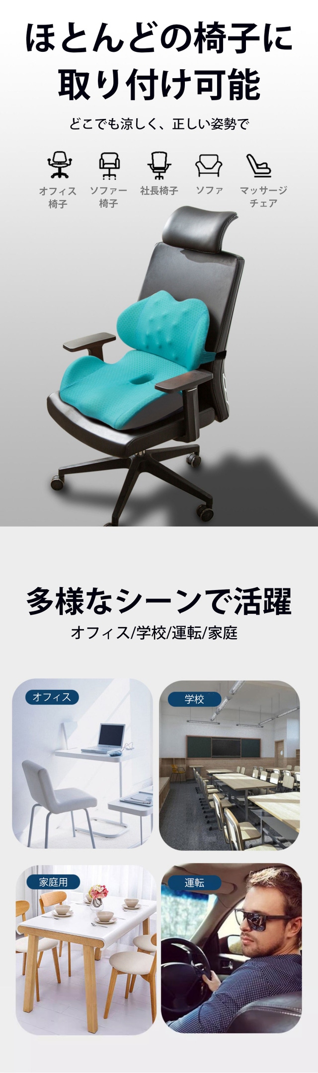 運転席やオフィス用のチェアなど、様々な椅子と互換性があるので、いつでもどこでも姿勢をケアできます。