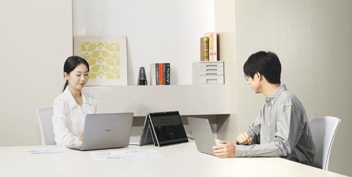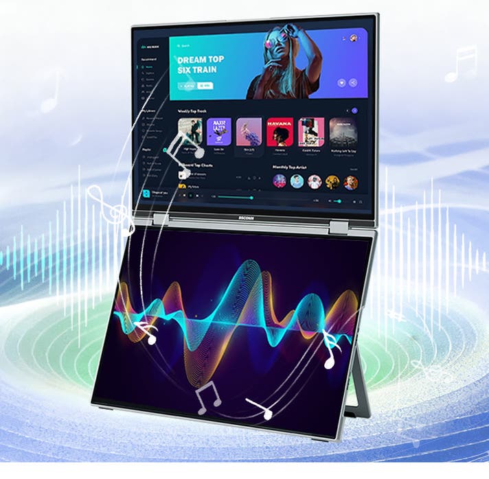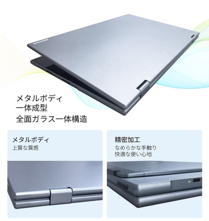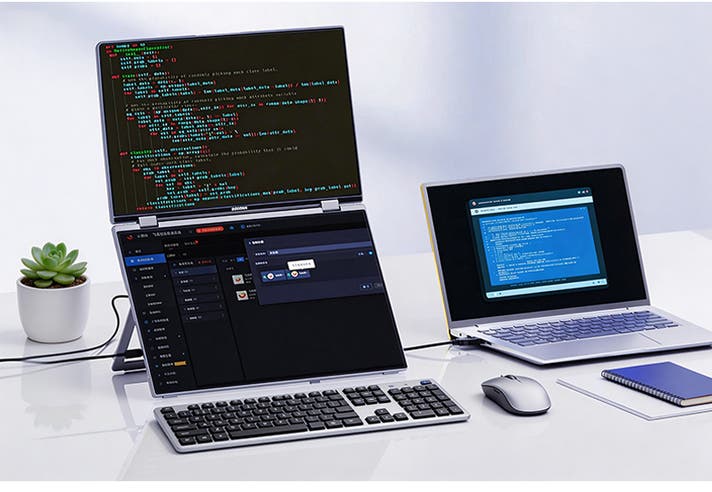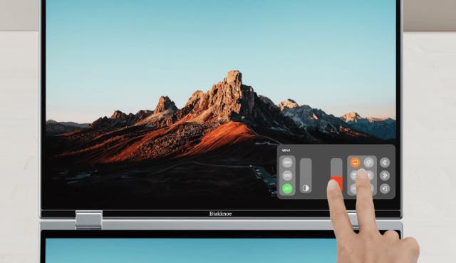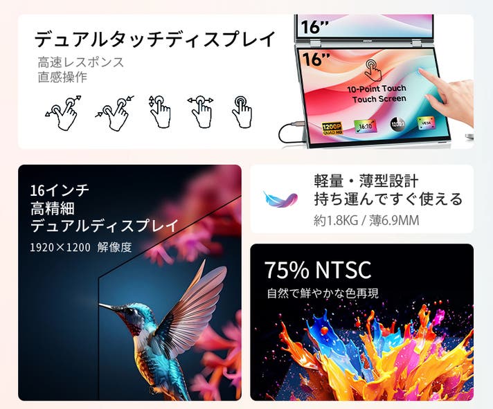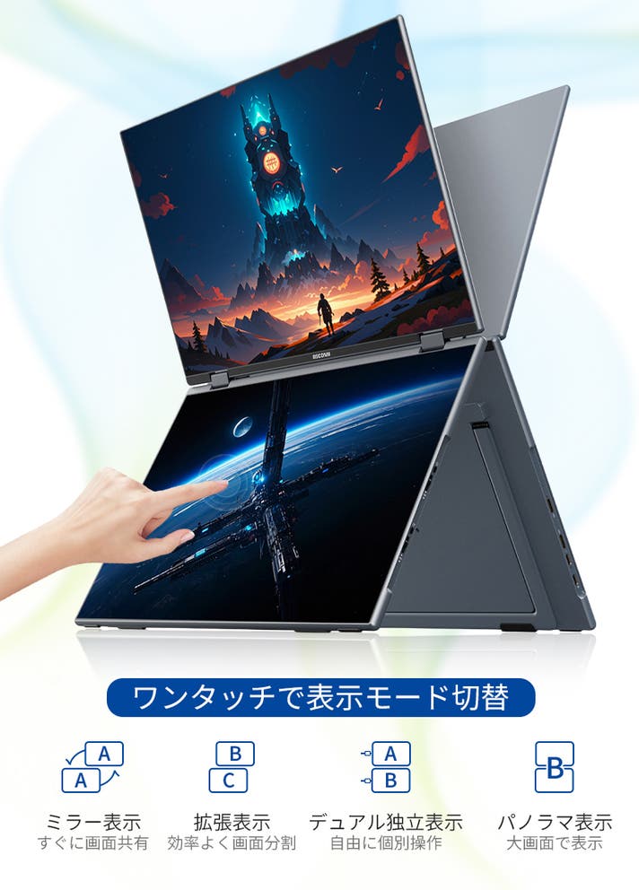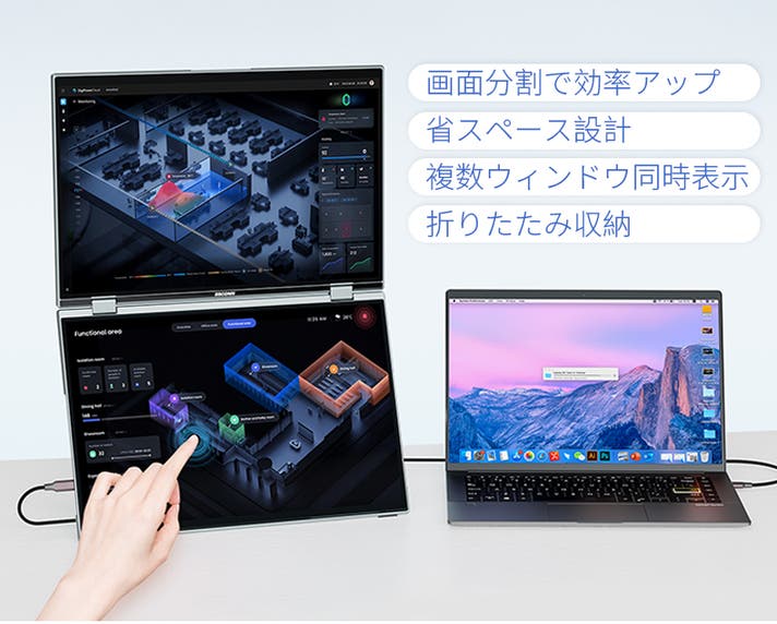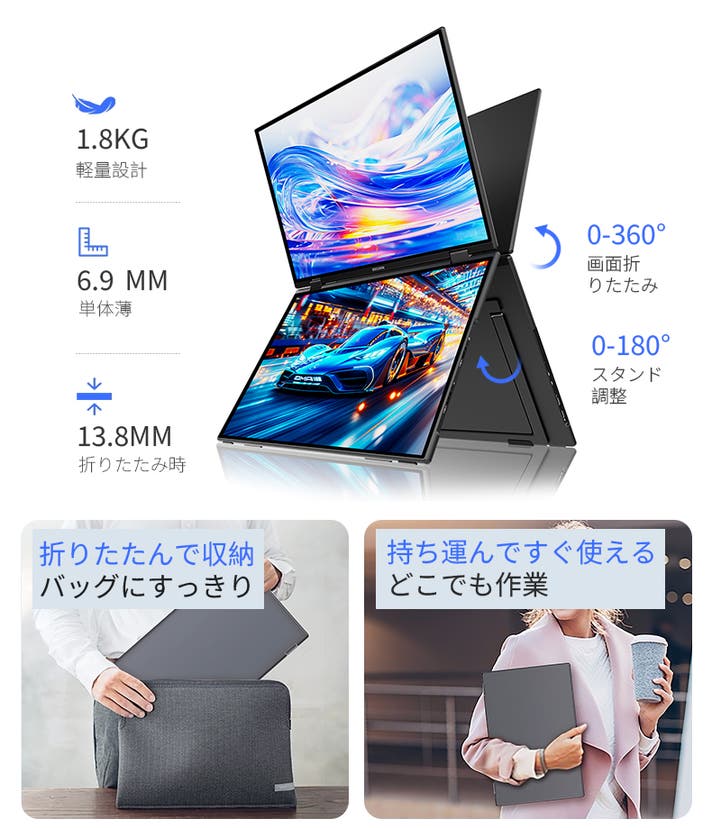 さらに上下両画面がそれぞれタッチ操作可能なため、片方で作業しながらもう一方を直感的に操作できるのが特長。アルミニウム一体成型の薄型軽量ボディ(約1.8kg)は、オフィスやテレワーク、出張先でも違和感なくフィットします。