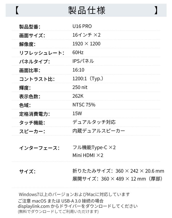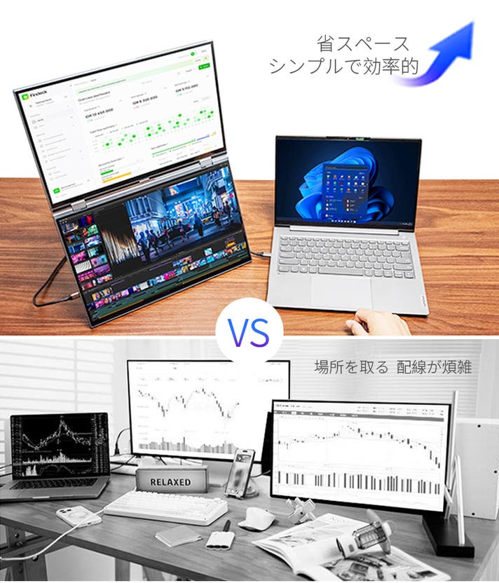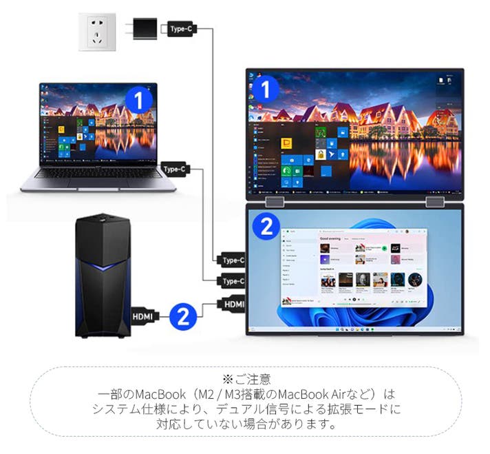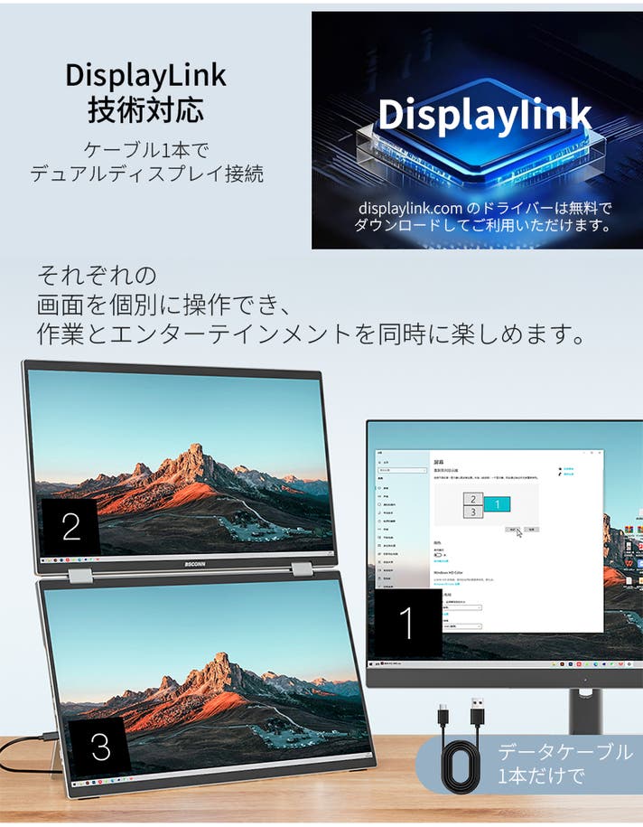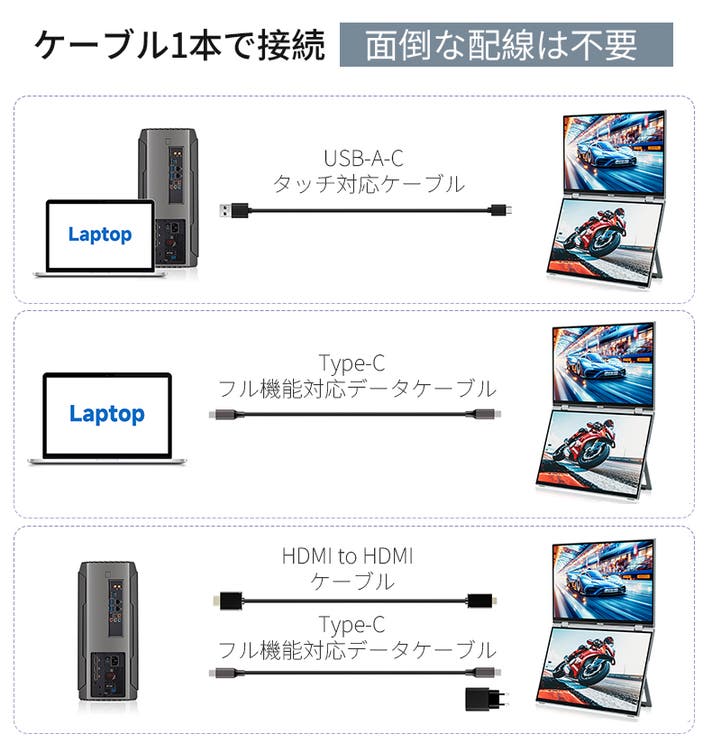 - ケーブル1本で簡単接続。配線すっきり、どこでもデュアル画面を実現。
