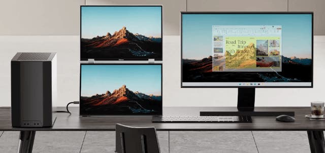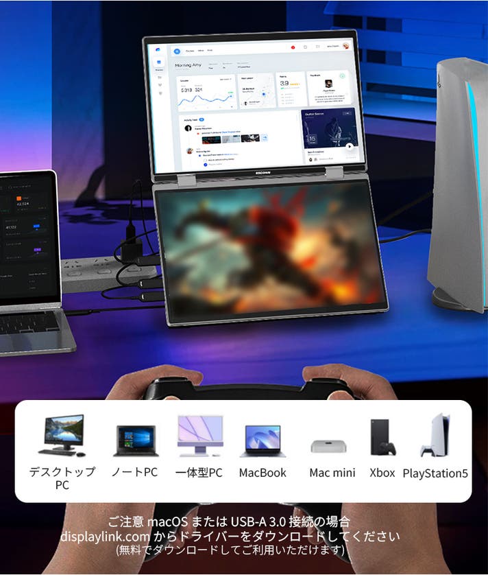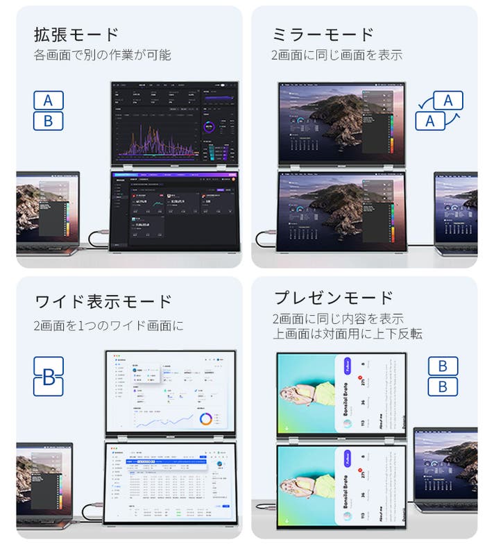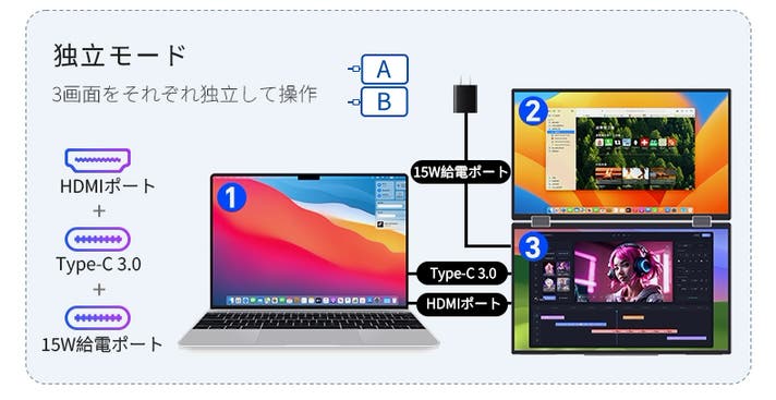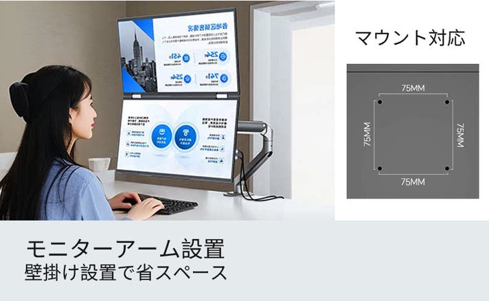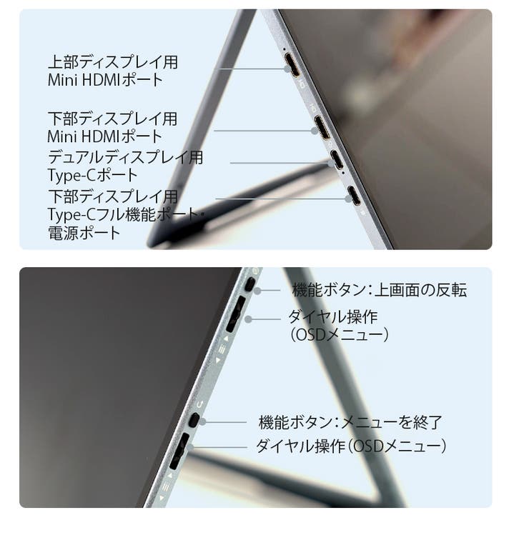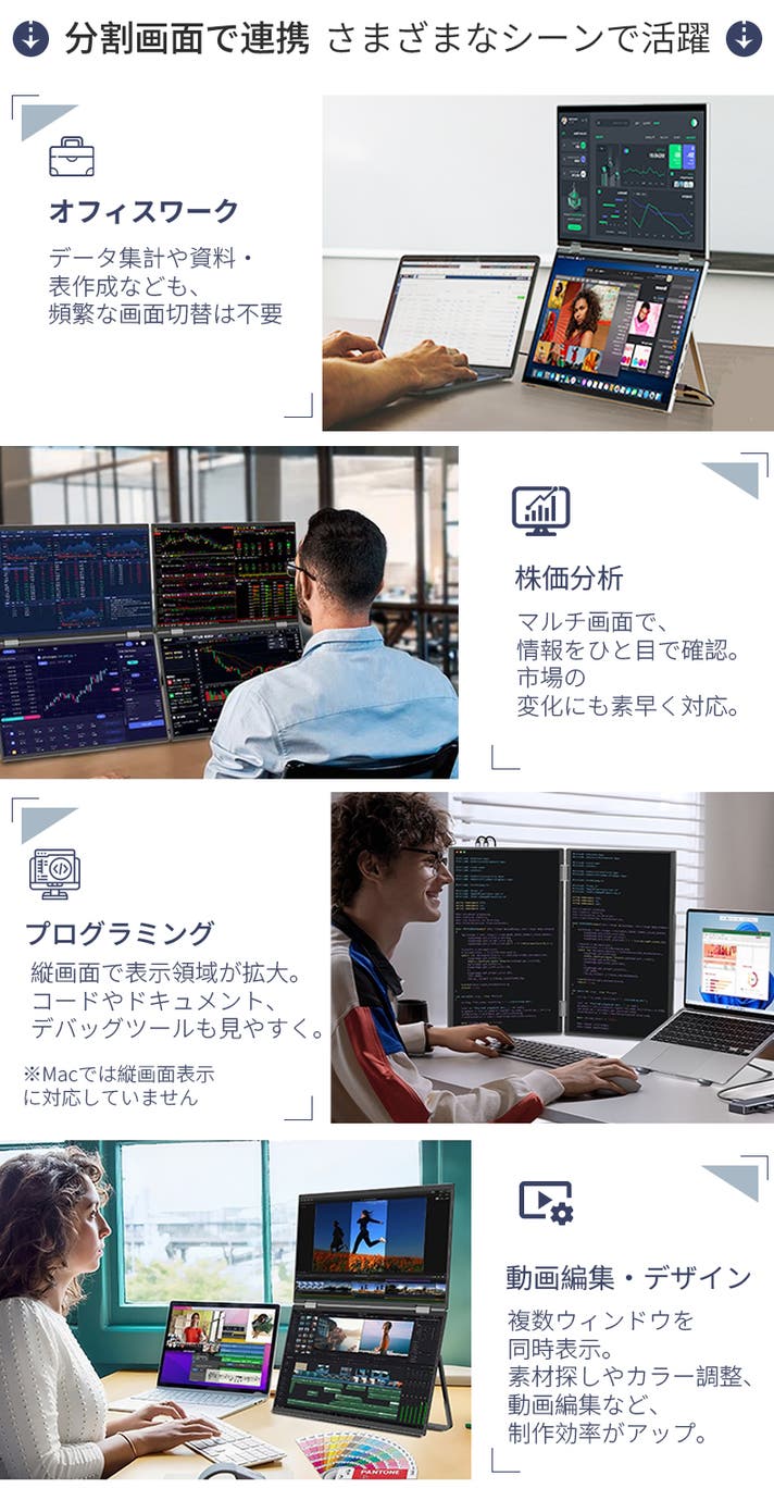 - ケーブル1本で簡単接続。配線すっきり、どこでもデュアル画面を実現。