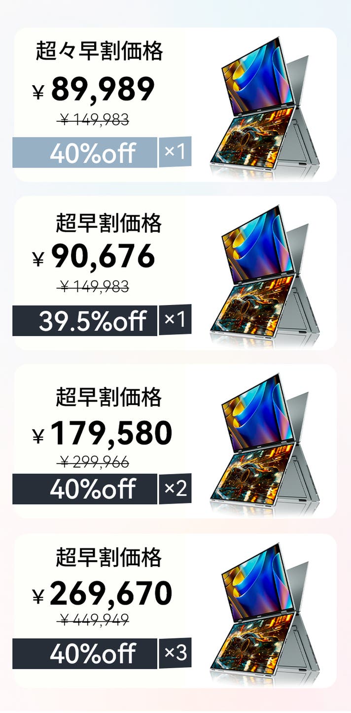 ・プロジェクト属性:16インチ デュアルディスプレイ ・サポート体制:日本語カスタマーサポート対応(国内代理店) ・実行者(国):日本 ・製品者:中国 ・製造者(国):中国 本製品は使用感に個人差が生じる可能性があるため、使用感等を理由とした返品・返金はお受けいたしかねます。 また、初期不良以外の理由による返品・返金につきましてもお受けいたしかねます。 【対応条件】 商品に初期不良がある場合、またはご注文内容と異なる商品が届いた場合には、商品到着後7日以内にプロジェクトページ内の「実行者にメッセージ」よりご連絡ください。 内容を確認のうえ、返金または良品との交換にて対応させていただきます。 【返金額】 リターン金額の全額 【返品送料/再送料】 実行者負担 ・ご使用のモニター環境により、掲載画像と実際の商品の色味が異なって見える場合がございます。 ・本プロジェクトにおいて想定を上回る応援購入をいただいた場合、生産体制の強化により、将来的に正規販売価格が予定販売価格を下回る可能性がございます。 製品は予定通りお届けできるよう万全を期して進行いたしますが、以下の理由により、お届け時期が遅延する場合がございます。あらかじめご了承ください。 ・海外輸送中のトラブルや通関手続き上のイレギュラー ・工場の生産状況、または想定を上回るご注文により、配送予定が大幅に遅れる可能性があります。 ・開発中の製品につき、デザイン・仕様が一部変更となる可能性があります。 ※記載のスケジュールはプロジェクト公開時点での予定となります。応援購入の性質上、配送遅延が発生する可能性がございます。 原則として配送遅延によるキャンセルはお受けできませんが、リターン配送予定月から3ヵ月以上遅延した場合に限り、ご希望の方にはキャンセル対応を行います。 本製品をお手に取っていただいた皆様にご満足いただけるよう、チーム一同、誠意をもって対応してまいります。 何卒ご応援購入のほどよろしくお願い申し上げます。 ※並行輸入品が流通する可能性がございますが、完全に防ぐことはできません。あらかじめご了承ください。 ※並行輸入品につきましては、正規代理店による保証の対象外となります。 ※正規代理店を通じてご購入いただくことで、日本国内における各種認証の取得および関税処理が適切に行われております。