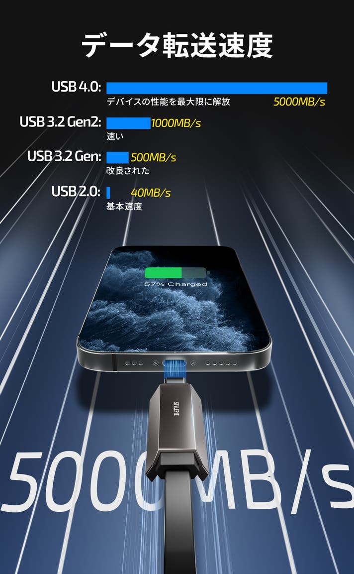 USB 4.0テクノロジーと先進のチップセットを搭載したUCableは、最大40Gbpsの転送速度で卓越したデータ転送体験を提供します。RAW画像、4K動画、大規模なプロジェクトを数秒で転送できます。重要な仕事の文書、ハイエンドのゲーム体験、あるいは丹念に作り上げたコンテンツ制作など、迅速かつ効率的な読み書き機能をお楽しみください。